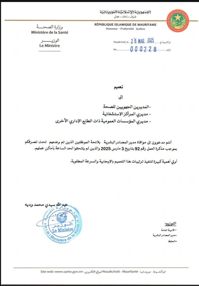 جاء ذلك في تعميم أصدره وزير الصحة عبد الله سيدي محمد وديه موجه للمديرين الجهويين للصحة ومديري المراكز الاستشفائية ومديري المؤسسات العمومية ذات الطابع الإداري الأخرى.