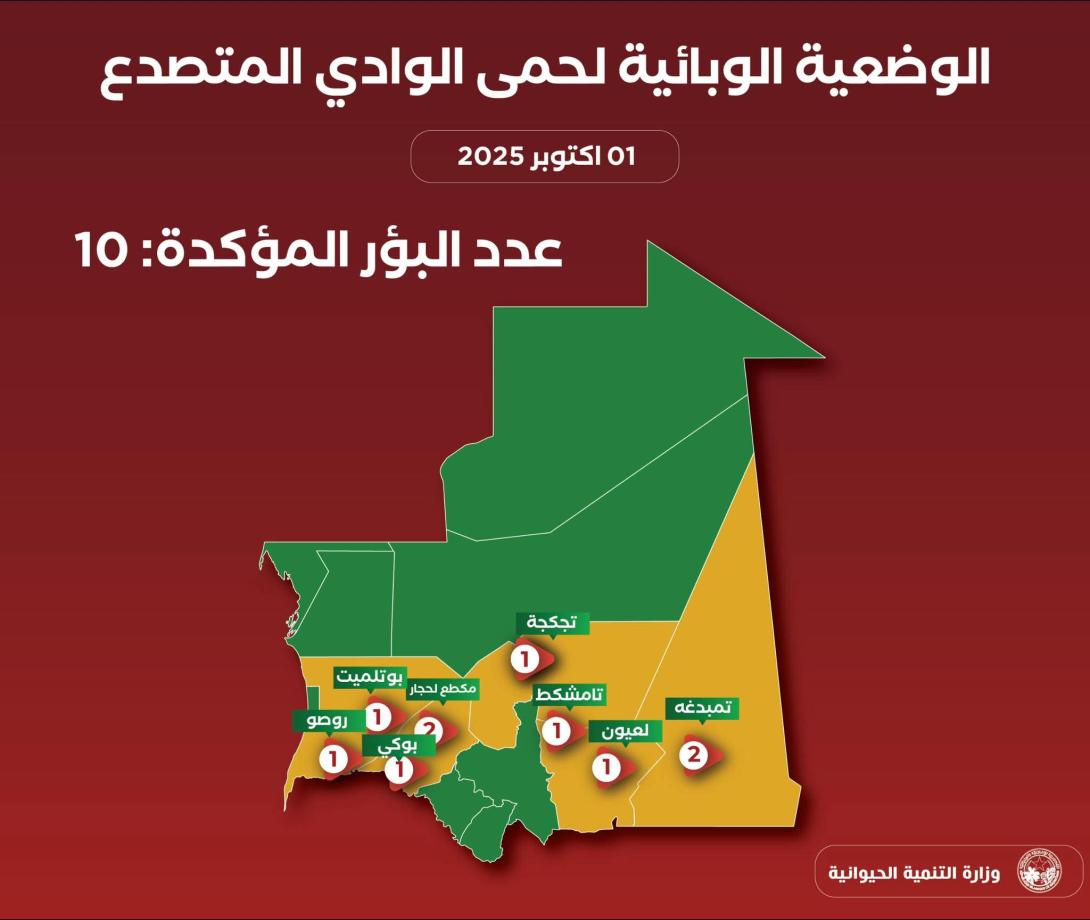 وأوضحت أن البؤر تتعلق بولايات الحوض الشرقي والغربي ووباية تكانت ولبراكنه والترارزة مشددة على سلامة 5 بؤر كان قد تم الاشتباه بها.