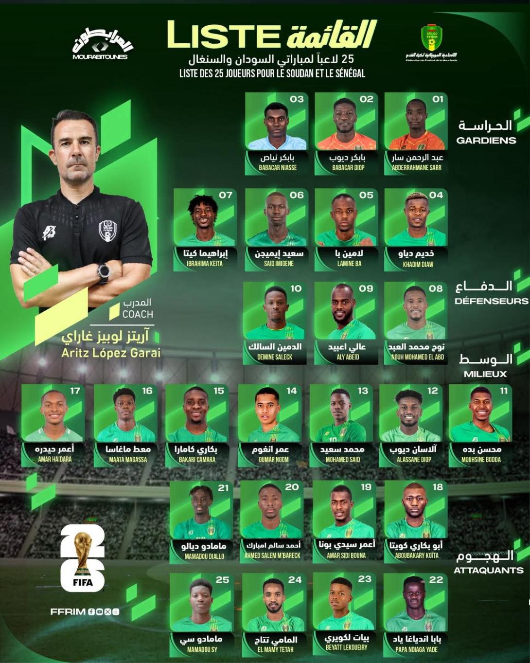 أعلن الناخب الوطني آرتيز لوبيز غاراي اليوم الـقـائـمـة الـرسـمـيـة للمنتخب الوطني "المرابطون" التي اختارها لمباراتي السودان في 10 من أكتوبر في دار السلام والسنغال في 14 من نفس الشهر في ديامنياديو.
