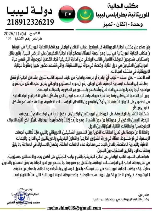 وطالب مكتب الجالية السلطات الموريتانية، ممثلة في وزارة الشؤون الخارجية والتعاون الإفريقي والموريتانيين في الخارج، بالعمل على تسوية هذه الملفات، وضمان معاملة متوازنة تعكس عمق العلاقات التاريخية والأخوية بين الشعبين الموريتاني والليبي.
